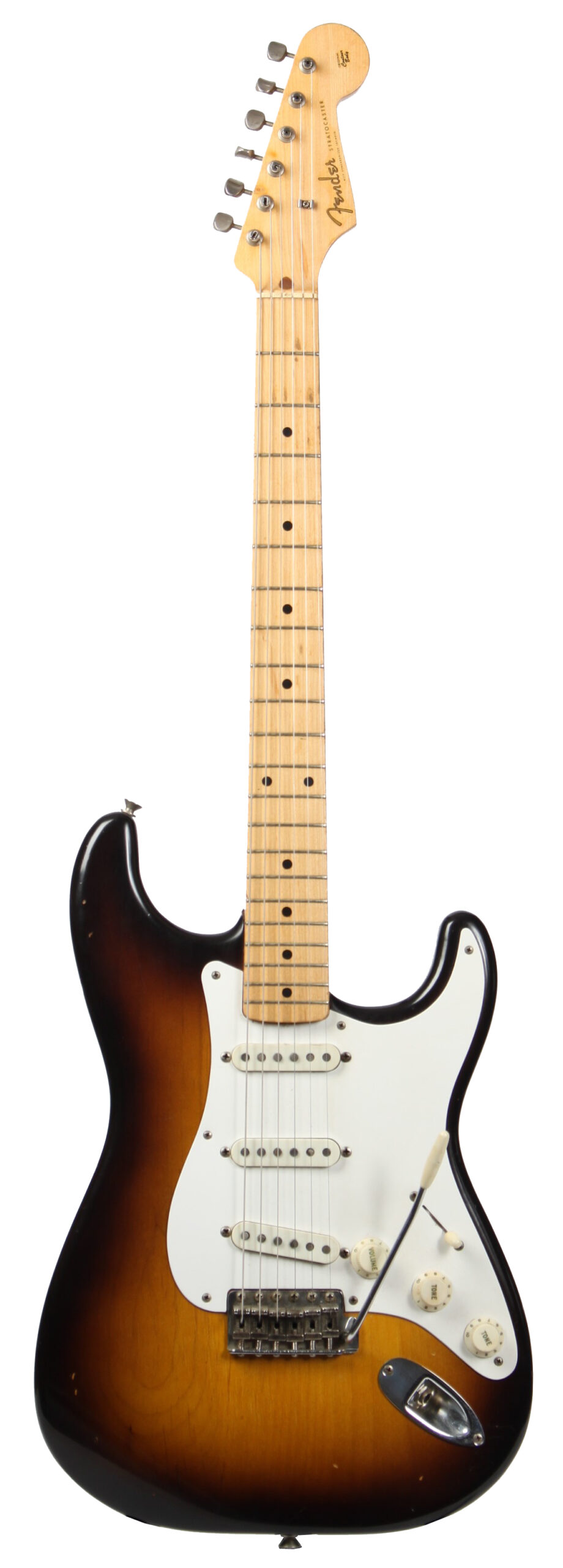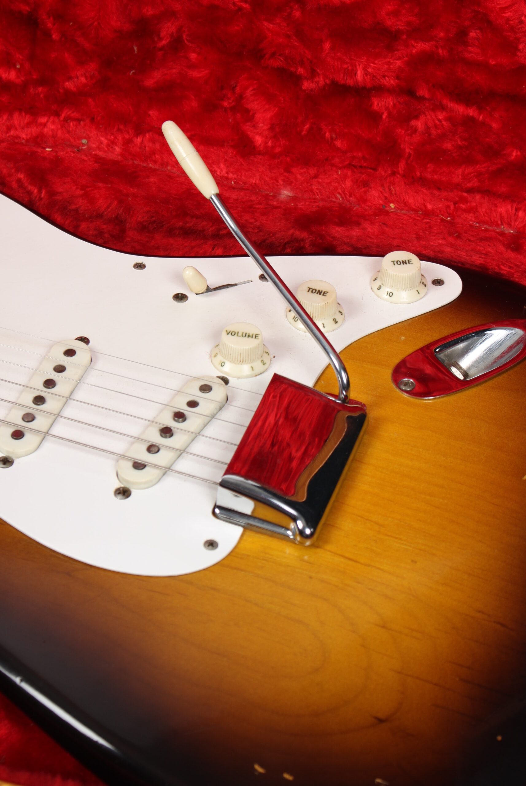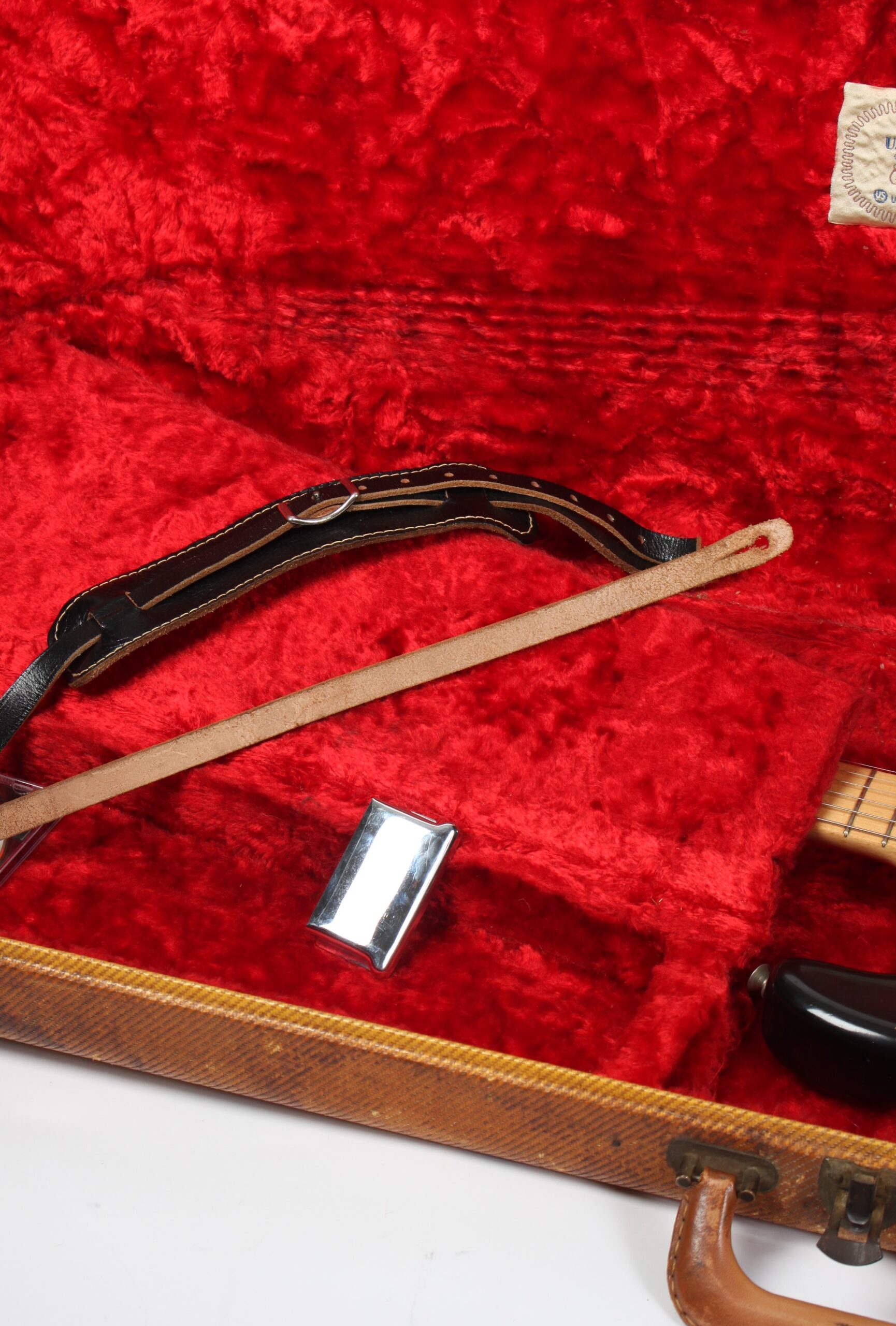 | Tremolo: | Fender “synchronized” tremolo with 6x “Pat.nr.stamped” steelsaddles |